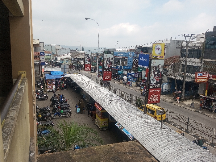 An elevated perspective captures a bustling street scene. A covered walkway dominates the foreground, lined with vendor stalls. Parked motorcycles fill a lot to the left. Across the walkway, a street is lined with buildings displaying various advertisements and storefronts, including "VIVO" and "Alfamat." A yellow vehicle traverses the road. Above the buildings, a cloudy sky completes the urban landscape.