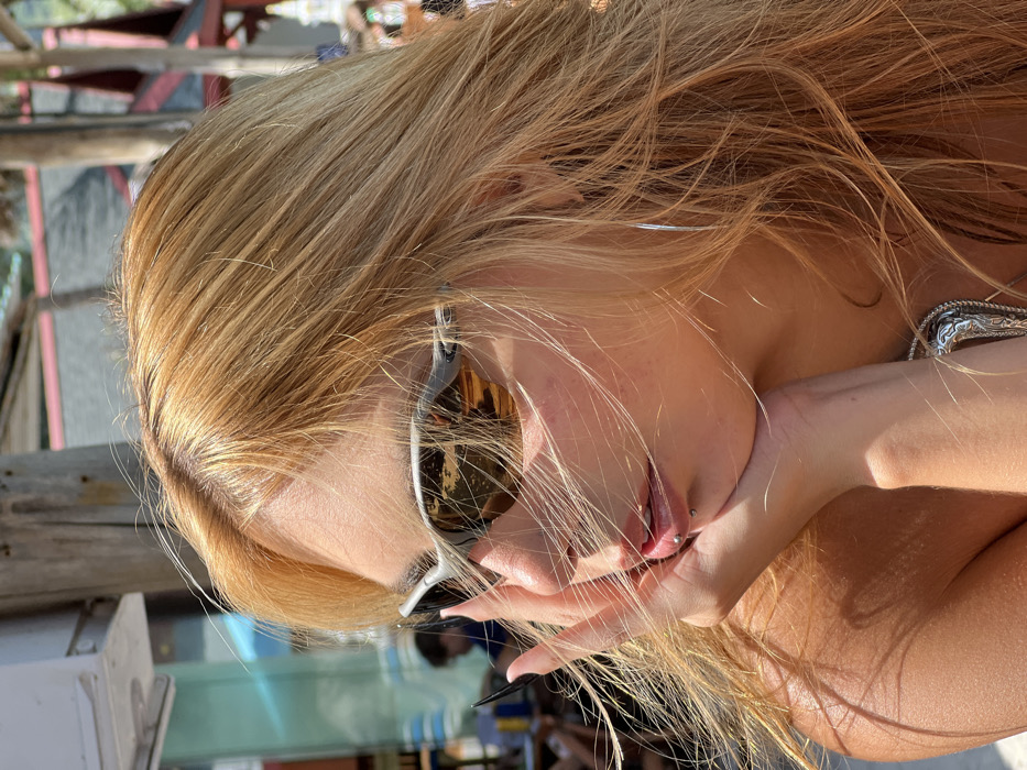 A woman with long blonde hair and white-framed sunglasses poses with her hand near her face. She is wearing a silver chain necklace and has a piercing on her lip. Her nails are long and painted black. The background includes an outdoor setting with glimpses of a building or structure, and other people in the distance. The image is slightly rotated, giving a tilted perspective.