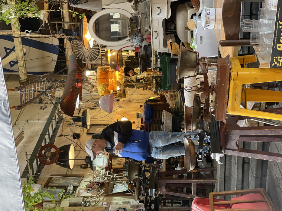 The image depicts an antique shop or market stall, likely situated in the Jaffa Flea Market (Shuk HaPishpeshim) within Tel-Aviv, Israel