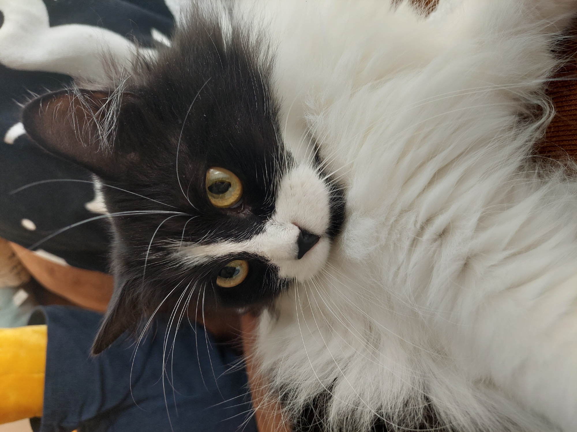 The image displays a close-up portrait of a domestic bicolored cat with long, predominantly black and white fur. The cat's head, ears, and upper back are black, while its lower face, chest, and extensive underbelly fur are white. Its eyes are amber-yellow with vertical pupils, directed slightly upward and to the viewer's right. Numerous long, white vibrissae extend from its muzzle. The animal appears to be resting on a reddish-brown textured fabric surface. The blurred background reveals additional elements: a dark blue fabric to the upper left, a yellow object in the upper center, and a black and white patterned object to the upper right, consistent with an indoor environment. The specific location within the city of Plovdiv, Bulgaria, is not discernible from the visual information presented in the image.