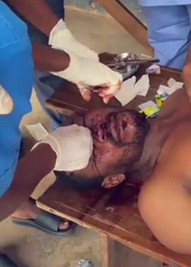 In a medium, close-up shot, medical professionals, wearing blue scrubs and white gloves, are attending to a man lying on a wooden table. The man has significant injuries to his face, including what appears to be an exposed eye and wounds around his nose and forehead, which are covered with blood. A portion of his body from the chest up is visible, and it is also stained with blood. Medical instruments, including scissors and forceps, along with gauze and medication are on the table within reach of the medical personnel. The environment appears to be an outdoor setting, possibly a makeshift medical station. The focus of the scene is on the medical treatment being administered to the injured man.