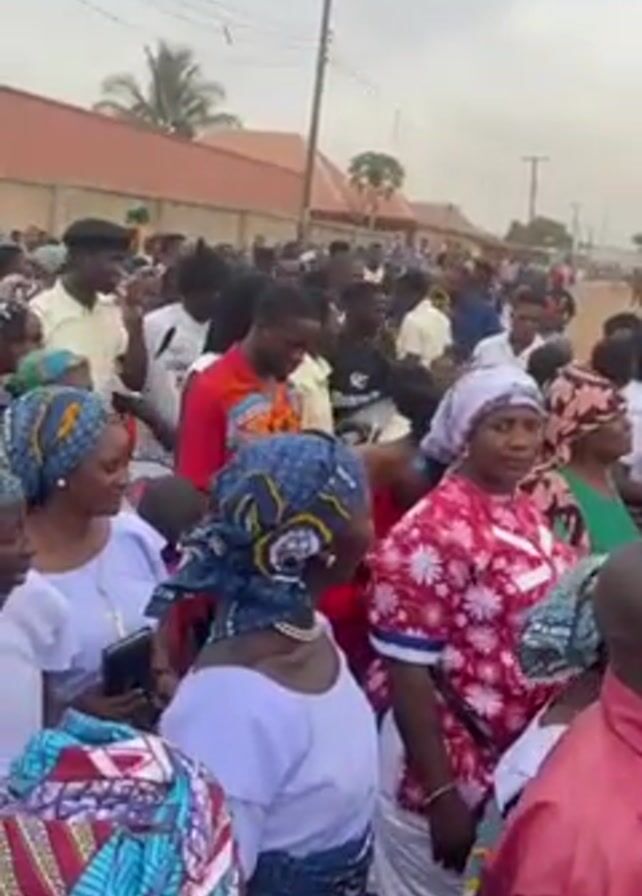 large group of people gathered in what appears to be a street procession or parade. Many are dressed in vibrant colors and traditional headwear, particularly the women. Some people are playing musical instruments, possibly drums, adding to the lively atmosphere. Buildings line the street with power lines overhead. The sky is overcast, creating a slightly muted light. The overall impression is one of a cultural celebration or community event.