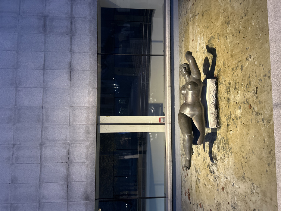 - "A bronze sculpture of a nude, reclining female figure, identified as "La Nymphe" by Rik Poot, is depicted within an empty, discolored concrete fountain basin" by FM-M0WFF2, licensed under CC BY 4.0