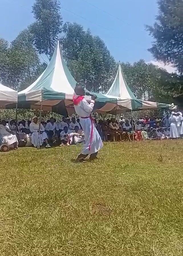 A man in a white robe with a red sash and headdress is speaking into a microphone on a grassy lawn in front of an audience seated under two large, green and white tents. The audience, mostly wearing white clothing, appears to be attentive to the speaker. Trees are visible in the background under a clear, blue sky.