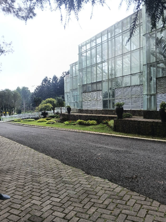 The image displays an outdoor scene in Munyati, Zimbabwe, dominated by a large, modern building constructed primarily of clear glass panels on the right side. This multi-story structure, appearing to be a greenhouse or a similar transparent facility, features a grid-like metal framework supporting its numerous glass sections, with horizontal louvered panels visible on its lower facades. Adjacent to the building's base is a tiered landscape designed with dark stone retaining walls, supporting dark potted plants and beds of green shrubs and smaller flowering plants. In the foreground, a herringbone-patterned gray brick pathway extends from the bottom left, transitioning into a dark asphalt road that curves slightly into the mid-ground. To the left of this road, a manicured grassy area is visible, interspersed with various trees and shrubs, and a white-railed pathway or bridge structure. Densely packed, dark green trees form a backdrop in the mid-to-far ground, under a bright, largely featureless sky. The top edge of the image is partially framed by out-of-focus dark tree branches or pine needles. A single human foot, wearing a dark shoe, is partially visible on the brick pathway in the bottom left corner. The scene is static, captured during daylight hours.