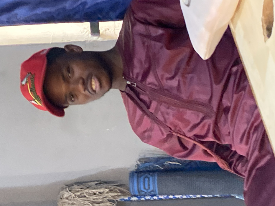 A Black male, approximately 20-30 years old, is seated indoors, looking directly at the camera. He wears a red baseball cap with a logo (resembling a bird and text) and a maroon traditional garment featuring a zippered neck and embroidered detailing. A gap is visible between his two upper front teeth. To the left, a light gray wall supports a mop with light-colored strands and two rolled-up prayer mats, one dark gray with blue patterns. A light-colored wooden table, partially visible in the bottom right, features a small, light object and a dark mark on its surface. The scene is located in a city within Unknown, Nigeria.