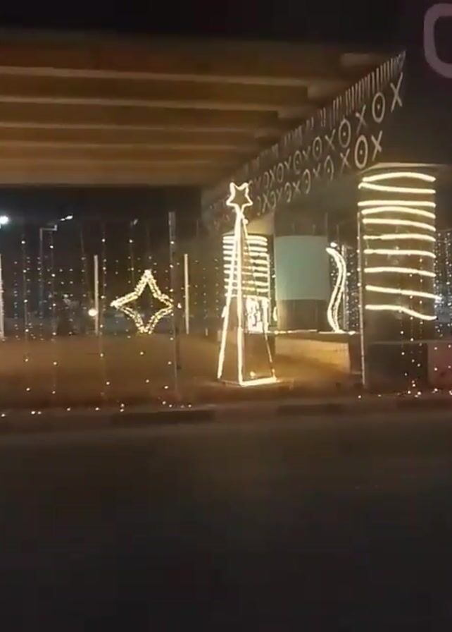 Christmas decorations under a bridge at night