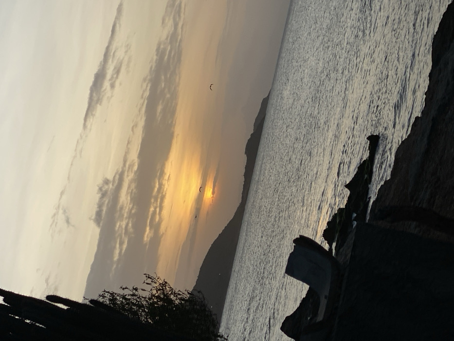 A scenic view of a body of water, possibly an ocean or a large lake, under a golden sunset. The sky is filled with clouds. There are birds flying in the sky. Part of a mountain is visible. The foreground is filled with vegetation and shadowy objects.