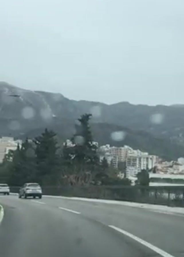 A car drives down a wet, winding road on a cloudy day. Other cars can be seen on the road, and buildings and trees are visible on the side of the road. A mountain range is in the background.