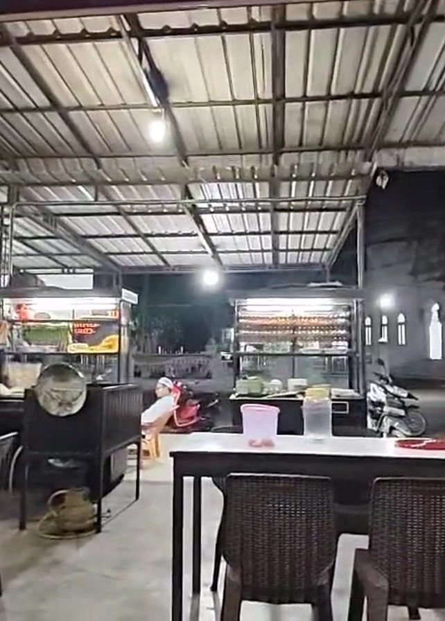 interior of a restaurant at night. The ceiling is a metal grid with lights. There are tables and chairs. A motorcycle is parked outside. A food stall with rotating skewers of food is visible. A person is seated in the background, wearing what appears to be a white head covering. A pink container and a clear jar sit on a table. The video appears to be taken from inside a building, looking out onto an open-air dining area. Pictures are visible on the wall in the foreground.