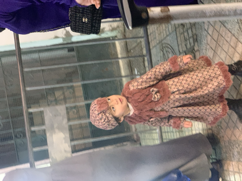 A young girl wearing a matching dress and hat with a brown, patterned fabric and fur trim poses. The girl stands near a metal gate and a sidewalk. Part of a woman's body wearing a purple dress and holding a small Chanel purse appears in the upper left corner. A metal bar is visible in the upper center of the image.