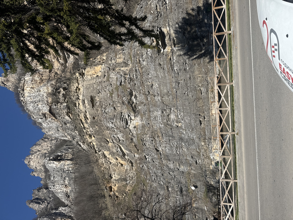 The image depicts a panoramic view of the Iskar Gorge near Milanovo, Bulgaria, under a clear blue sky. Dominating the background is a massive, multi-tiered limestone cliff face, exhibiting varying shades of grey, beige, and white strata. Sparsely vegetated deciduous trees cling to the lower slopes and crevices of the rock formations, some appearing bare. High on one of the jagged peaks, a small white cross is visible. Another small, dark structure is discernible within a recess on an upper cliff face. In the mid-ground, a wooden fence with a distinct criss-cross pattern spans horizontally, separating a visible body of water, likely a river or stream, from an asphalt road in the foreground. The water appears calm, reflecting some light. On the left side, a white, circular object resembling a satellite dish is affixed to the lower section of the cliff. The foreground features a segment of an asphalt road with two faint white lane markings. The bottom right corner reveals a portion of a white vehicle's hood, marked with red and black Cyrillic text "EASY КРЕДИТ" (Easy Credit) and a stylized logo, indicating the perspective is from inside or directly above this vehicle. A large, dark shadow cast by coniferous tree branches, originating from the right edge of the frame, falls across the road, the fence, and the lower part of the cliff face, indicating direct sunlight from the left. A smaller tree, possibly coniferous, partially obscures the upper right portion of the cliff. No individuals are present in the visible scene.