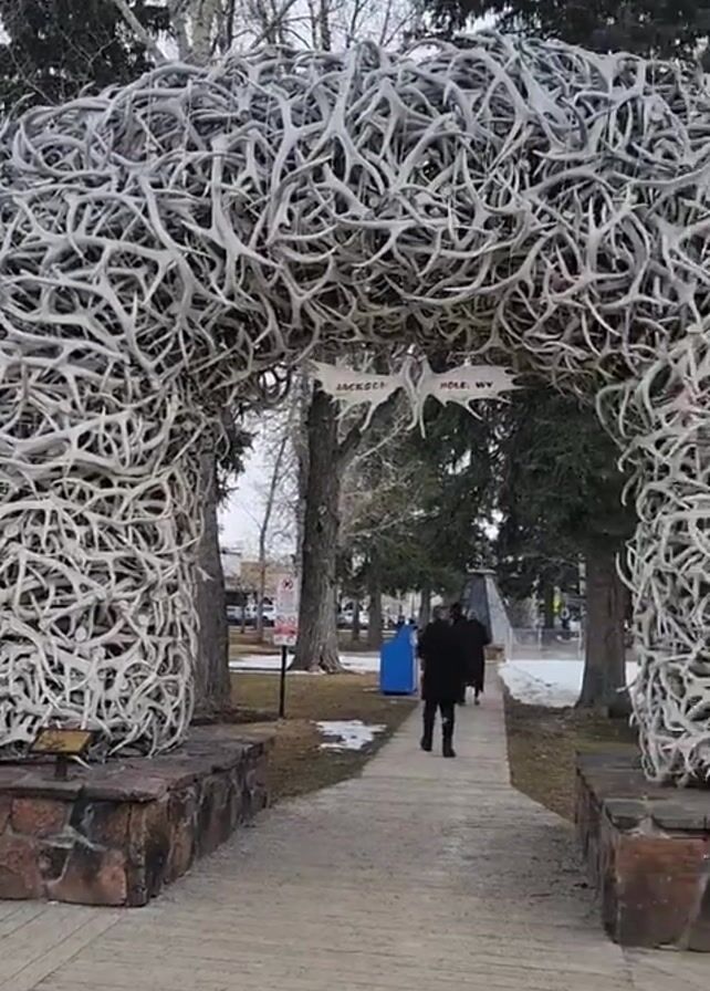 path leading under an archway made of antlers. A person in a black coat walks along the path toward the archway. The archway has a sign on it that says "JACKSON HOLE, WY". There are trees and snow on the ground on either side of the path. The camera pans to show a street with parked cars, buildings, and mountains in the background. There is a sign that says "Million Dollar Cowboy Bar". There are people walking on the sidewalk. The sky is overcast.