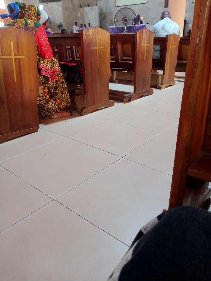 The image depicts the interior of a religious building, likely a church, located in Unknown, Unknown. The perspective is from a low, seated position within a wooden pew. In the foreground, left of center, a person is partially visible, dressed in a multi-patterned fabric garment with red, black, and yellow hues, paired with a red upper garment and a light-colored head covering. Their feet, adorned with patterned flat shoes, rest on the light-colored tiled floor, which has dark grout lines. A dark bag is placed on the pew bench beside them. To the right, a bald male is observed from the back, seated in a wooden pew, wearing a light-colored checkered shirt. Rows of light brown wooden pews, each featuring a light-colored cross insignia on its end panel, extend into the background. In the mid-ground, a large black standing fan is positioned on the floor. Beyond the fan, several individuals, some clad in white robes with red trim, are visible near an altar area draped in purple fabric. A lit candle in a holder is present on a surface near this area. A white projection screen is partially visible high on the far wall. The floor is covered with clean, light-colored square tiles, and the walls are plain and light-toned.