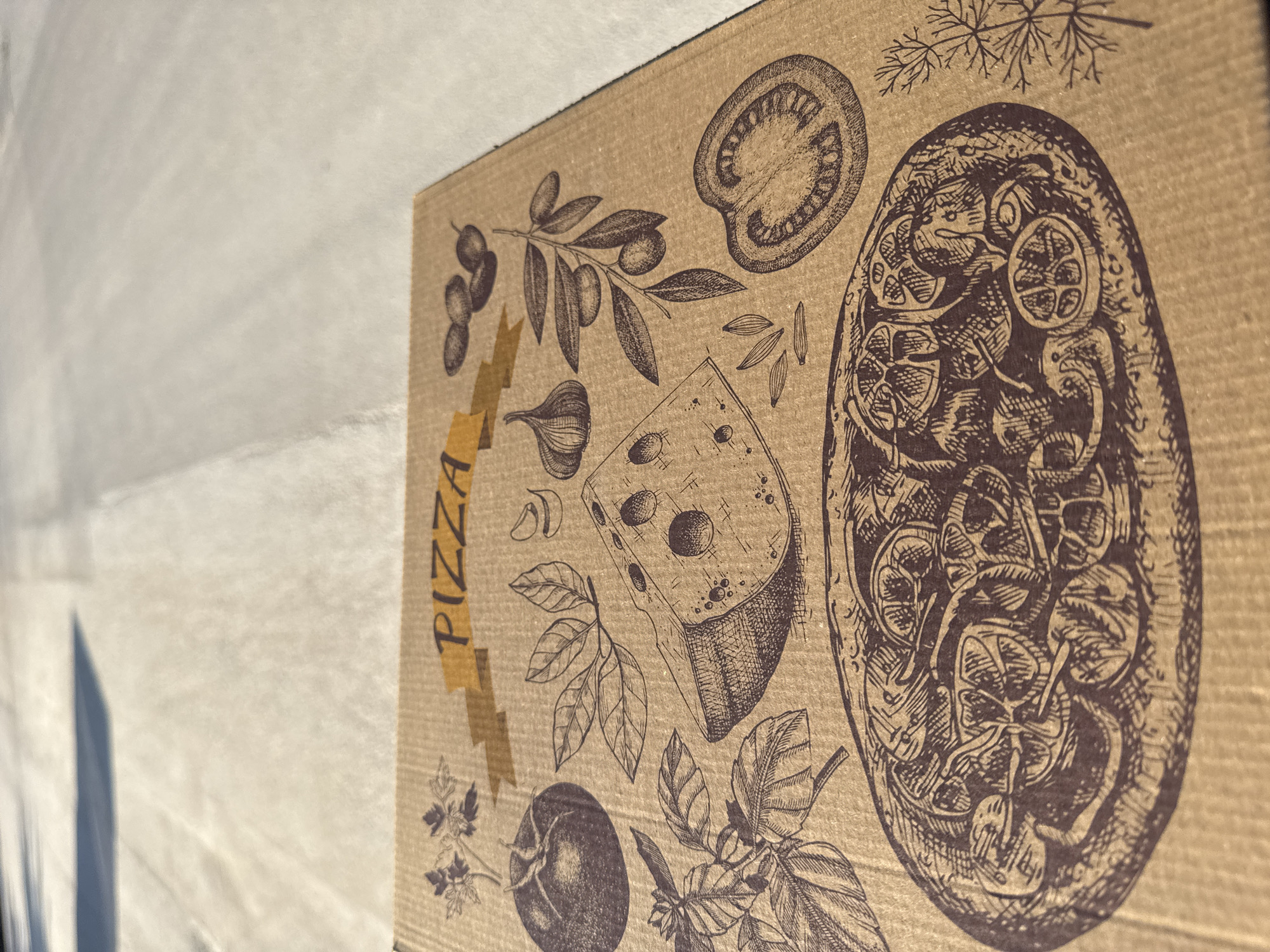 A close-up photograph depicts the corner of a pizza box with illustrations of pizza toppings, a slice of pizza, and the word "PIZZA" along a taped corner