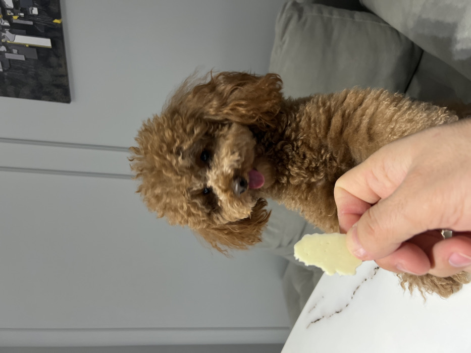 A small, brown poodle attentively watches a hand holding a piece of cheese. The dog’s tongue is slightly out, indicating anticipation. The background includes a gray couch and a modern art piece on the wall. The photo is taken at an angle, with the table surface visible beneath the hand and cheese. The lighting is soft and diffused.