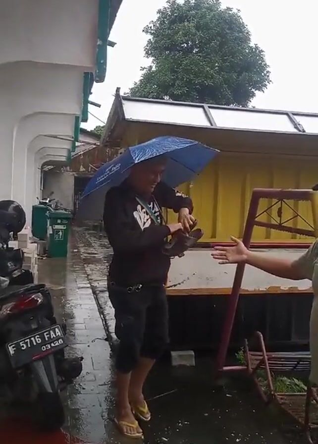 two men interacting in a wet outdoor environment. One man holds a blue umbrella to shield himself from the rain. He wears a black jacket, black shorts, and yellow sandals. He has a small bag slung across his shoulder and is holding a small, dark object in his hand. The other man, wearing a light green shirt and a dark baseball cap, reaches out his hand towards the first man. The ground is wet, suggesting it has been raining recently. In the background, there is a building with a green-and-white trim, a yellow and black container, and a motorcycle parked nearby. A playground-like structure with yellow posts and a red frame is also visible. The overall scene appears to be a somewhat crowded and utilitarian outdoor space.
