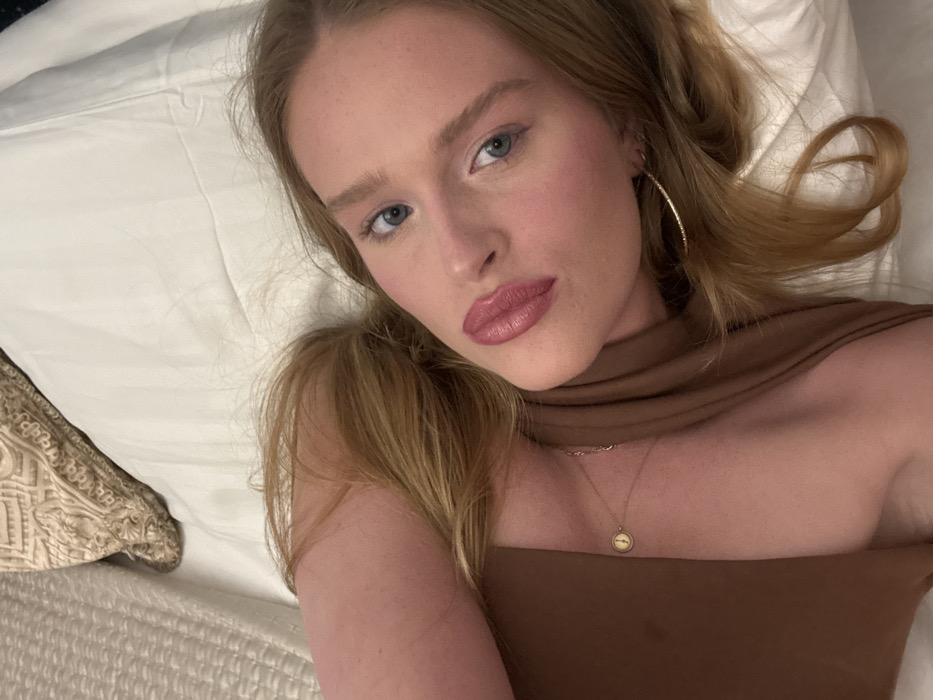 A woman with light skin and blonde hair lying on a white bed. She wears a brown, strapless top with a high collar and a gold necklace. Her makeup features pink blush and lipstick. She has blue eyes and is wearing large gold hoop earrings. A pillow with a beige patterned cover is visible in the lower left corner of the image. The overall lighting is soft and warm.