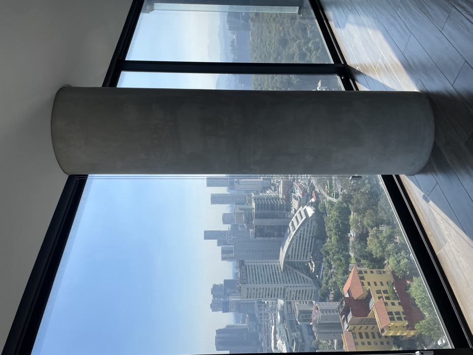 A modern building interior features a horizontal, cylindrical gray concrete structure spanning a large window. The view outside showcases a vibrant cityscape with numerous high-rise buildings, interspersed with green trees and a clear blue sky. Sunlight reflects off the polished wooden floor. The window frame is sleek black.