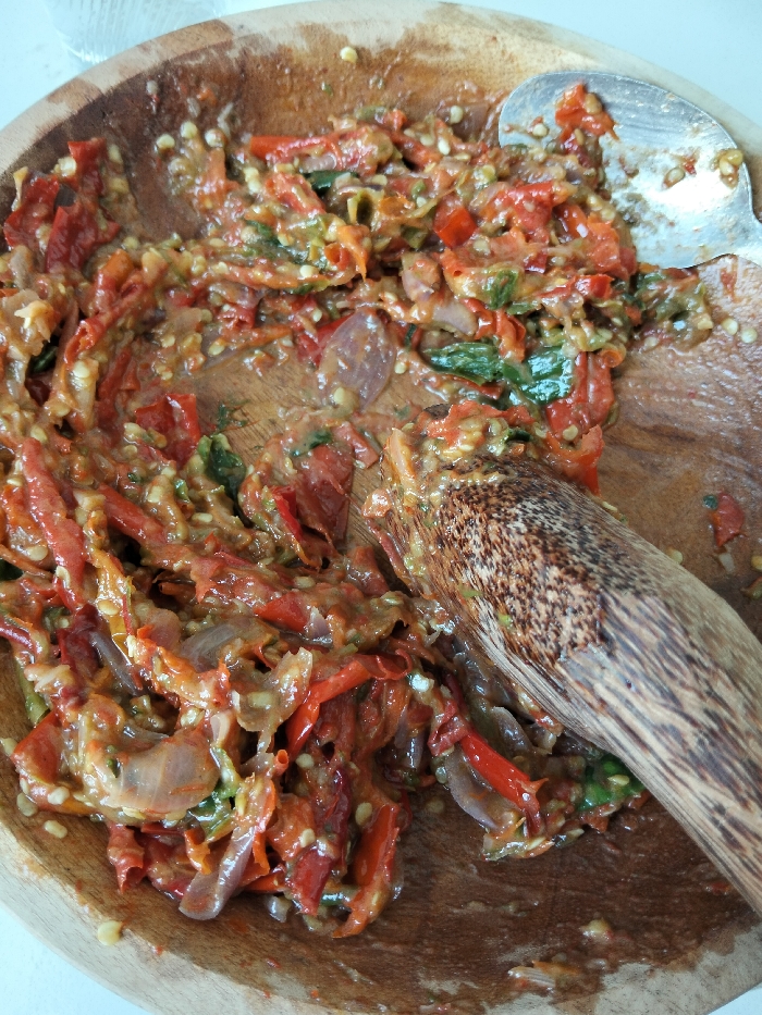 In a wooden bowl, a vibrant red chili paste, or sambal, is being prepared