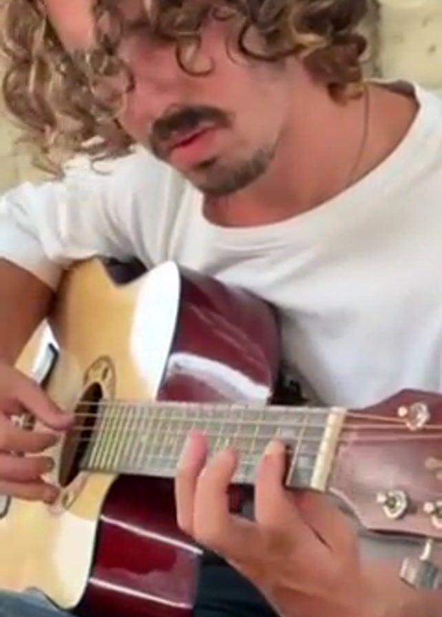 A medium shot captures a person with curly brown hair, a light mustache, and a goatee, wearing a white t-shirt and denim shorts. They are intently focused on playing a reddish-brown acoustic guitar, their fingers moving across the strings. The background is slightly blurred, suggesting an outdoor setting. The shot remains steady, highlighting the musician's focused expression and guitar-playing.