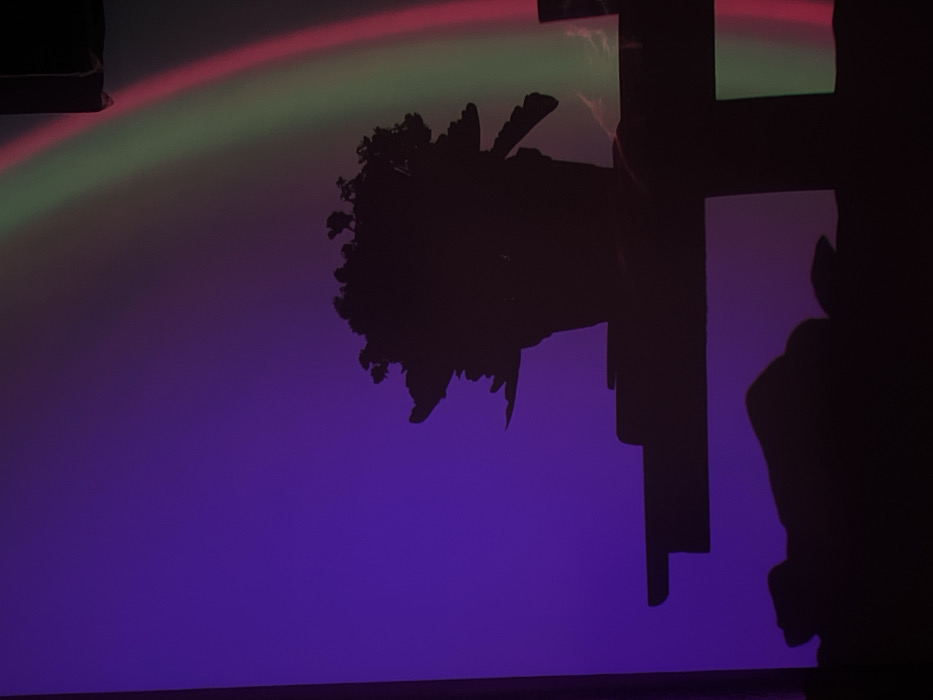 The scene depicts an interior space located in Nha Trang, Vietnam, captured in low light with prominent artificial illumination creating strong silhouettes and color effects. A potted plant with a dense cluster of foliage is centrally positioned in the mid-ground, rendered as a dark silhouette. This plant rests on a dark, flat surface, likely a table or shelf, which extends horizontally across the lower half of the frame, also appearing in silhouette. Below this surface, at the bottom of the image, additional indistinct dark shapes indicate more objects or furniture in shadow. The background, a vertical surface, exhibits a split illumination: the left side is bathed in a deep purple light, while the right side features a distinct, arc-shaped rainbow projection with visible bands of red and green. A vertical dark element, possibly a door frame or architectural edge, is present along the far left side of the composition. No individuals are depicted, and all visible subjects are static.