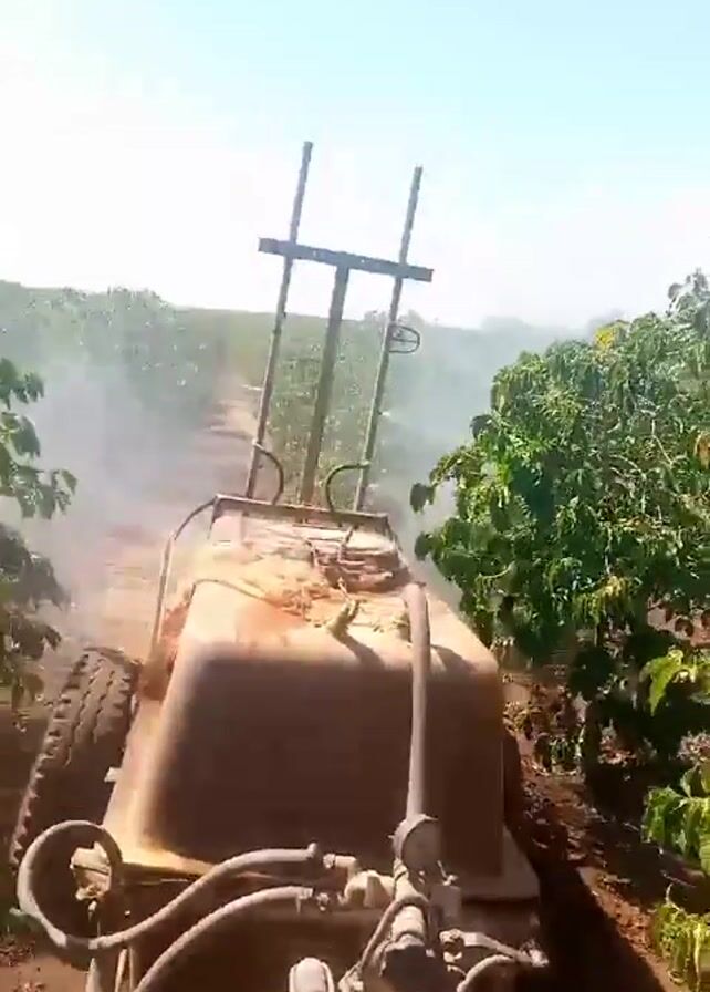 first-person perspective from what appears to be a mechanized sprayer driving through a field of small trees. The sprayer is rusty and seems old, with a tank, hoses, and a simple metal frame. White smoke or mist is being sprayed from the machinery, presumably to treat the plants. The trees are arranged in neat rows, and the ground is reddish-brown dirt. The sky is clear and blue, suggesting a sunny day. The video is somewhat shaky, reflecting the movement of the vehicle.