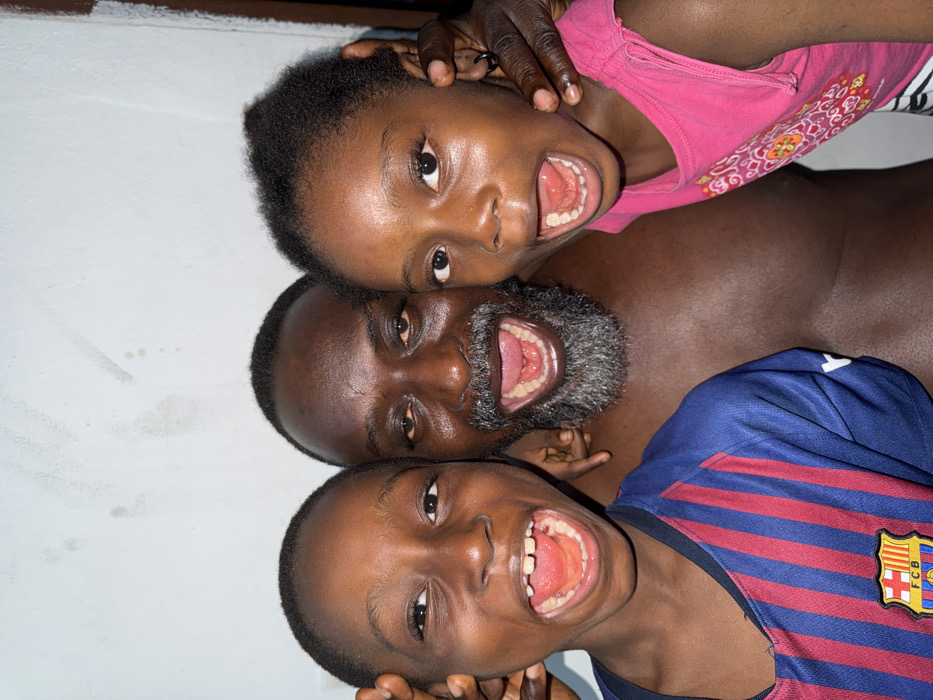 An indoor scene in Ado, Nigeria, features three individuals of dark complexion positioned closely together against a light-colored wall with minor imperfections. A dark-skinned adult male with a graying beard stands centrally, shirtless. His arms are positioned around the shoulders of a male child to his left and a female child to his right. All three individuals have their mouths wide open, in an apparent vocalization or expression, and are looking directly towards the camera. The male child wears a blue and red striped FC Barcelona jersey. The female child wears a pink sleeveless top featuring a lighter patterned design on the front; black and white striped fabric is visible at the bottom right of the frame, indicating a lower garment.