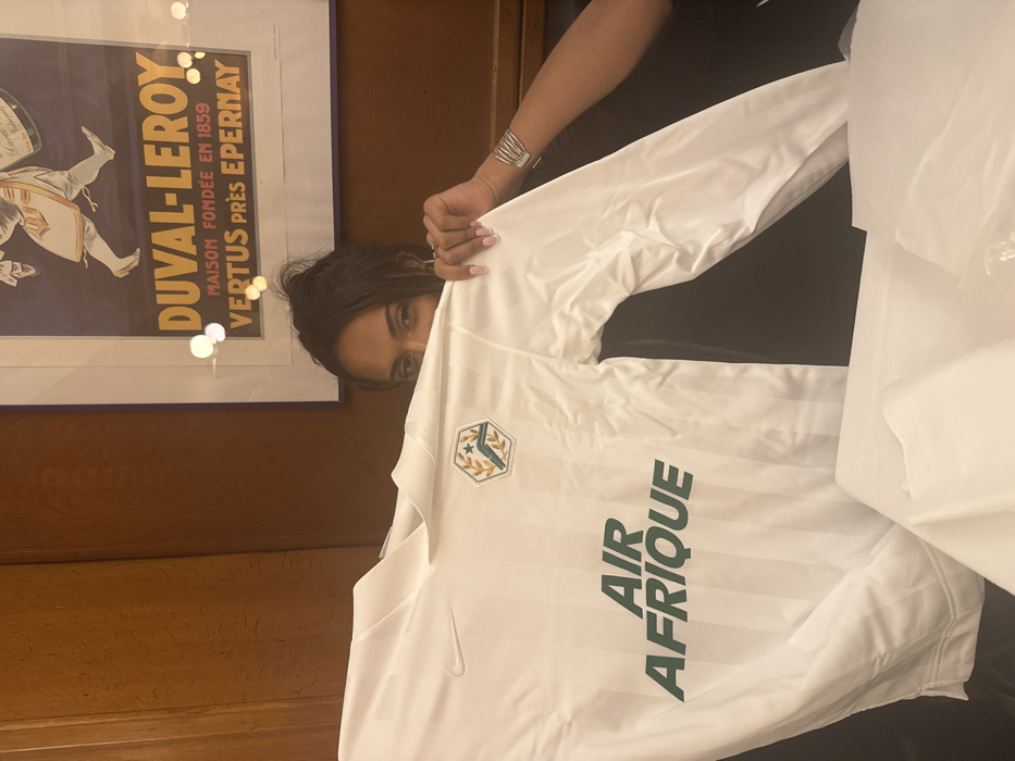 A person holds a white sports jersey with green lettering that reads "AIR AFRIQUE