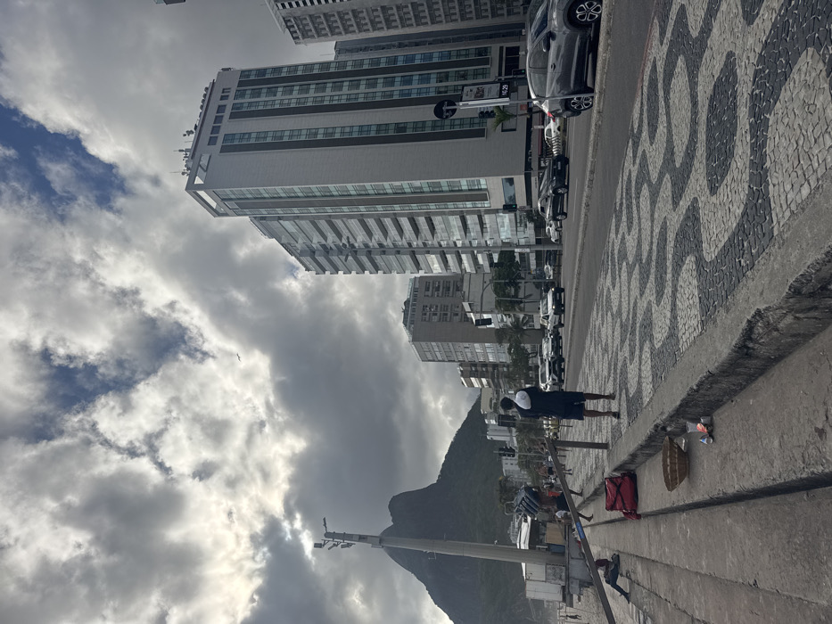 A tall building dominates the left, towering over other structures under a cloudy sky. A mountain range stands in the distance. The patterned sidewalk leads to a curb where several items are placed, including a basket and a red bag. People and vehicles are visible along the street.