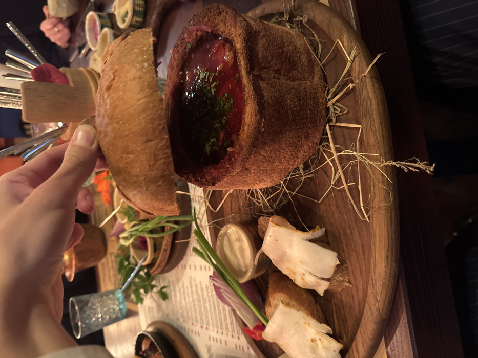 An indoor, close-up scene depicts a meal served on a wooden table within a restaurant setting in Polianytsia, Ukraine. The primary subject is a large, rustic loaf of bread, hollowed out and serving as a bowl for a dark red soup, likely borscht, garnished with chopped green herbs. A light-skinned hand, with visible fingernails, is actively lifting the rounded bread lid from the soup bowl. The bread itself has a firm, browned crust. Adjacent to the bread bowl, on a round wooden serving board, are several accompanying items: two slices of toasted bread, each topped with a thin piece of white, cured fat (salo), one showing a yellowish spice dusting. A small, light-colored ceramic ramekin contains a white creamy condiment. Beside it are several stalks of fresh green onion, a slice of red onion, and a small red chili pepper segment. Scattered dry hay or straw strands are present on the wooden board as part of the presentation. In the blurred background, other elements of a dining table are visible, including a light blue textured glass, a menu printed on paper, various small dishes with colorful contents, and a wooden container holding multiple metal utensils. A second hand is partially discernible in the far right background. The lighting is warm and artificial, consistent with an indoor dining environment.