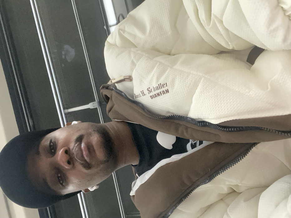A man with a black cap, a black t-shirt with a white design, and earbuds is seen in the picture. He is wearing a cream-colored puffer jacket with brown trim and a visible zipper. The jacket has the name "Brett H. Schuller DIANFAN" printed on it. The man is facing the camera with a neutral expression. The background includes a door or window frame with vertical lines.