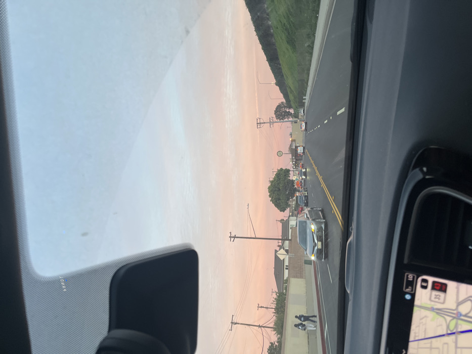 From a car's interior, a road stretches ahead under a soft pink sky. Two lanes are visible, with vehicles including a silver sedan and a truck in the distance. Utility poles line the roadside, with buildings and a tree partially obscured. A grassy slope rises on the right, and the car's dashboard and navigation screen frame the view. People walk on a sidewalk beside the road.