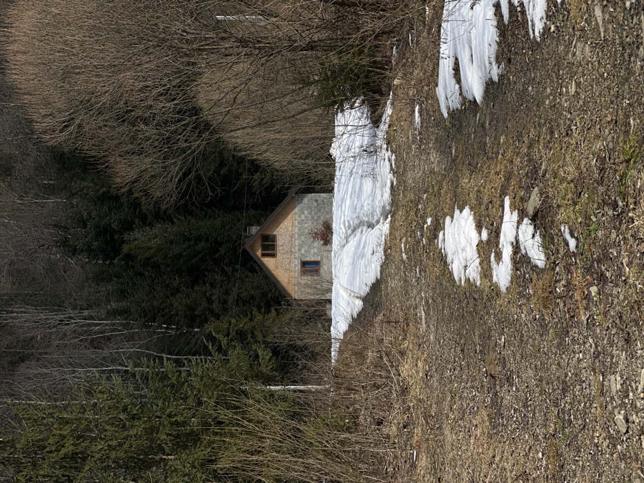 The image displays a two-story house situated in a natural, wooded setting in Korostiv, Ukraine, under daylight conditions, indicative of late winter or early spring. A dirt path, partially covered by irregular patches of melting snow and exposed brown earth, occupies the foreground. The path ascends gently towards the house. The house itself features a lower story constructed of grey, possibly block or stucco, material and an upper gable end clad in light brown shingle-like siding. A single window with a blue frame is visible on the lower level, and a multi-pane window with a brown frame is located on the upper level. A dark pitched roof tops the structure, with a visible chimney on the left side. A small evergreen sapling stands directly in front of the house on a snow-covered incline which shows shallow tracks. The background is dominated by dense forest: dark green coniferous trees are prominent on the left, while numerous leafless deciduous trees define the right side of the woodland. No individuals or active interactions are present in the scene.