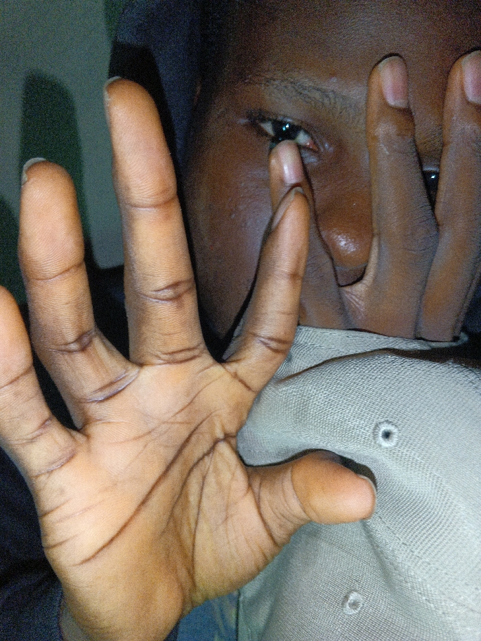A close-up image shows a person with dark skin partially obscured by their hands. The left hand is outstretched, palm facing forward, with visible lines and variations in skin tone. The right hand is closer to the face, partially covering one eye. A light gray fabric, possibly clothing, is visible near the bottom of the image, held between the fingers and face. The person's eye, nose, and part of their face are visible between and behind their fingers.