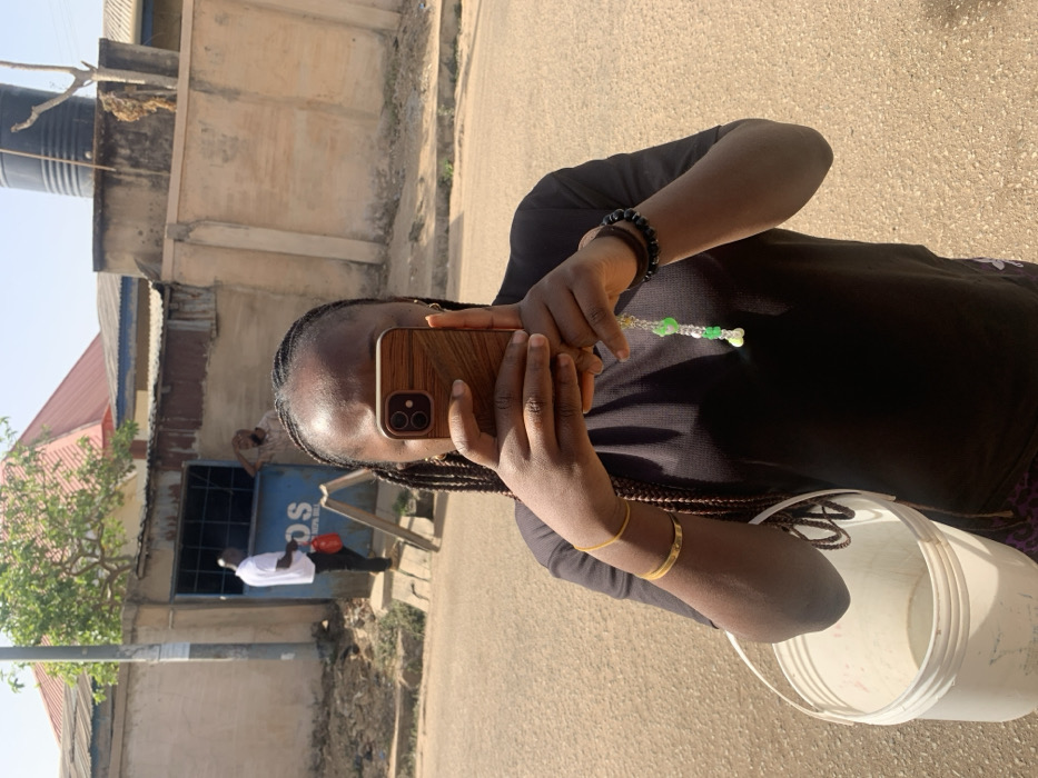 The image depicts an outdoor street scene in Jos, Nigeria, under bright, sunny conditions. In the foreground, a person with dark skin and braided hair is holding a smartphone horizontally with both hands, obscuring their face from the nose upwards. The smartphone has a light brown, wood-grain patterned case and visible dual camera lenses. The individual wears a black short-sleeved top. A thin gold-colored bracelet is on the left wrist, while a black beaded bracelet and a green and white beaded charm hang from the right wrist. A white plastic bucket with a handle is held by the individual's left hand. In the mid-ground, a paved road surface leads to a blue-painted building facade featuring the letters "OS". An open window or doorway is visible. Two male figures are present near this building: one in a white shirt and dark trousers, holding a red bag, stands with his back partially to the camera. The second male, with a visible beard, is partially seen inside or near the building's entrance. A wooden A-frame sign leans against the wall near the entrance. The background includes various urban structures: corrugated metal roofs, a light-colored concrete wall spanning horizontally, a red-roofed building, and a black plastic water tank mounted on a distant rooftop. Sparse trees with green foliage and bare branches are also visible.