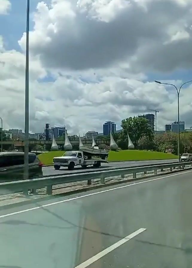 view from inside a moving vehicle, likely a car, driving on a highway. The weather is sunny with some fluffy white clouds in the blue sky. The highway has multiple lanes, and cars and motorcycles can be seen driving in both directions. A grassy median with several white teardrop-shaped sculptures is visible between the lanes. Beyond the median, there are buildings, including some taller office buildings. Street lights line the highway. The vehicle is moving on a relatively straight section of the road. A billboard is visible on the right side of the road.