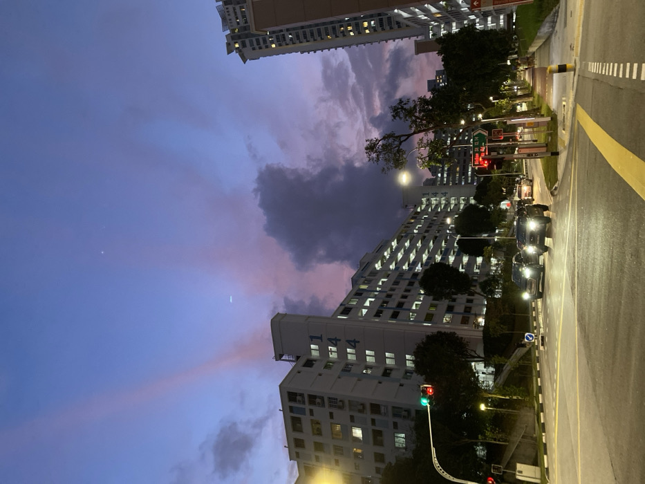 The image captures an urban street scene at dusk in Bishan, Singapore