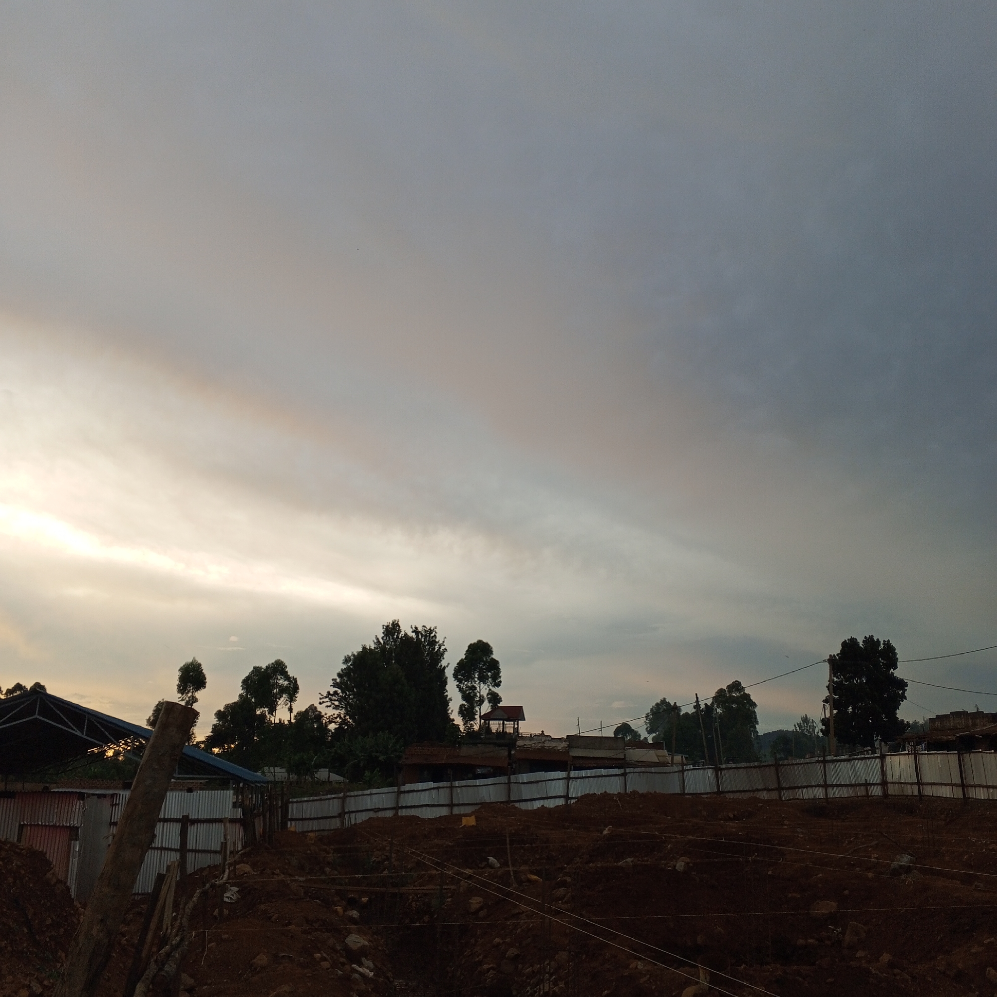The image depicts a construction site in Borabu Chitago ward, Kenya, under a cloudy sky. The ground is disturbed, with mounds of dark soil and visible building materials. A corrugated metal fence surrounds the perimeter of the site. Trees are visible in the background. The sky shows variations in color, suggesting either dawn or dusk. A simple wooden structure with a red roof can be discerned further back. Some buildings are visible beyond the fence. A wooden pole stands prominently in the foreground on the left side.