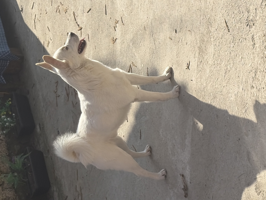 - "The scene depicts a medium-sized white dog standing on a light-colored concrete surface in Kriva Bara, Bulgaria" by FM-82mPe2, licensed under CC BY 4.0