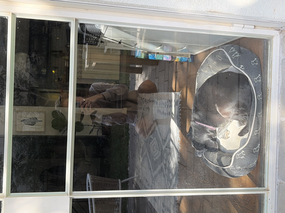 The image presents an interior view through a multi-pane glass door or window, framed by white sashes. In the lower central portion, a dark-colored dog with a light pink collar is observed curled asleep within a grey, oval-shaped dog bed patterned with white dog silhouettes. Direct sunlight illuminates a section of the dog and its bed on a light-colored floor. Reflected in the glass from the exterior is a person crouching, holding a smartphone in their right hand to capture the scene. This individual wears a light-colored long-sleeved top and shorts, with a ring visible on their right hand. The reflection further reveals an outdoor patio area with patterned paving, a wicker chair, and green foliage from trees and plants. A framed botanical print and a large potted plant are visible on an exterior wall. Behind the reflections, visible through the glass, are interior elements including a white multi-drawer cabinet, a tall white radiator, and a stack of colorful items. The scene is a residential setting, likely a backyard or patio area adjacent to an interior living space, located in Tel Aviv, Israel, under natural daylight.
