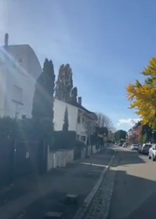 The camera pans slowly up an empty residential street on a sunny day. The buildings on either side are primarily white, with dark fences and green shrubbery. Cars are parked along the right side of the street. A tree with vibrant yellow foliage stands out against the blue sky. The street is paved with dark asphalt and has a light-colored stone gutter.