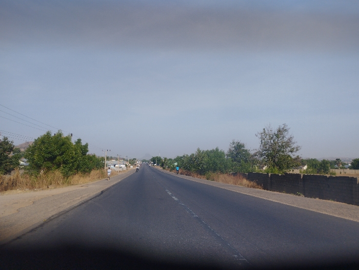 straight, paved road with a single lane in each direction, located in Kaltungo, Nigeria, at the coordinates 9