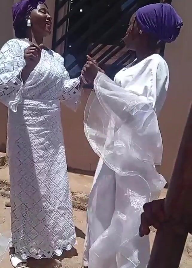 three women dancing. They are all dressed in white robes and purple head coverings. The woman in the center has white lace on her dress. The other two have flowing fabric sleeves. The ground they are on looks like sand. A building with a barred window is behind them. Other people are nearby.