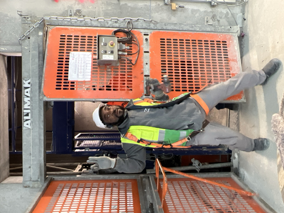 The image displays a male construction worker posing inside a building under construction in Aulnay-sous-Bois, France. He is positioned in front of an open Alimak industrial hoist system, identified by the "ALIMAK" branding above the entry. The man, with a beard and wearing a white hard hat, ear protection, a grey long-sleeved top, a high-visibility yellow and green safety vest with an attached harness, grey work pants, and dark work boots, is looking directly at the camera with a slightly surprised expression. He wears grey gloves and holds a cordless drill in his right hand. His left arm is raised, with two fingers extended in a peace or victory gesture. The hoist features orange grated safety doors, with one partially open on the left and another fully open on the right, revealing the interior shaft. A control panel with a red emergency stop button and two black buttons is mounted on the inside of the right orange door. A white sign on this door displays French text instructing to contact security for door opening. The floor is bare concrete with minor debris, and concrete structural elements are visible in the background.