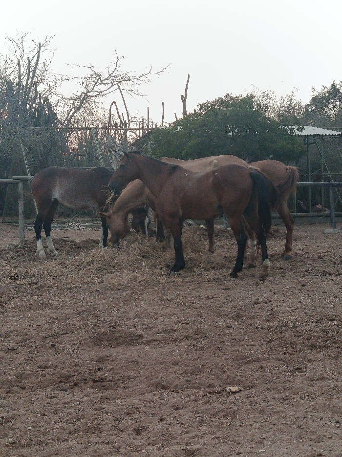 The scene is located in Guayacancito, Venezuela. The image displays an outdoor enclosure containing a minimum of five horses. The ground consists of dry, reddish-brown soil with scattered dry hay, upon which several horses are actively feeding. The central foreground features a brown horse with dark lower legs and tail, positioned over a pile of hay. To its left, another horse with a dark brown body and distinct white lower legs stands near a wooden fence post. Additional brown horses are partially visible behind and to the right of the central animals, also consuming hay. The background on the left reveals a rustic fence made of wooden posts and wire, behind which arid vegetation including thorny branches and leafless trees is present. To the right, a cluster of dense green foliage obscures a metal-roofed structure. The sky above is uniformly light, suggesting an overcast condition or specific time of day. No human subjects or interactions are depicted.