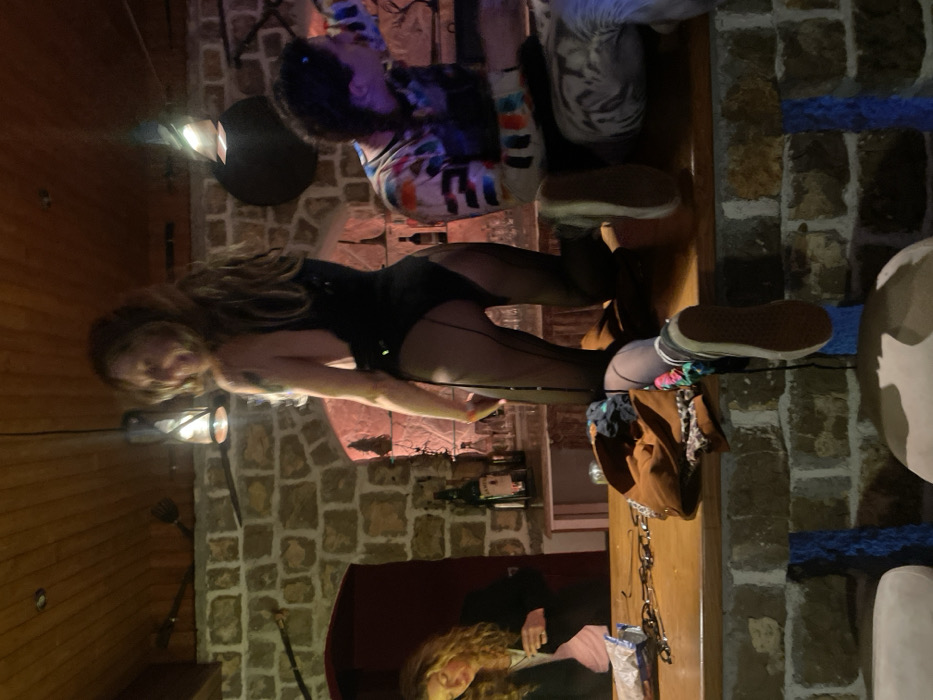 gathering of people in a dimly lit, stone-walled room. A woman in a black bodysuit and tights is positioned in the center, seemingly dancing or posing. Other individuals are seen in the background, including one with curly hair in a colorful shirt and another with blonde hair in a black shirt. The setting appears to be a bar or social space, with furniture, wine bottles, and various decorations present.