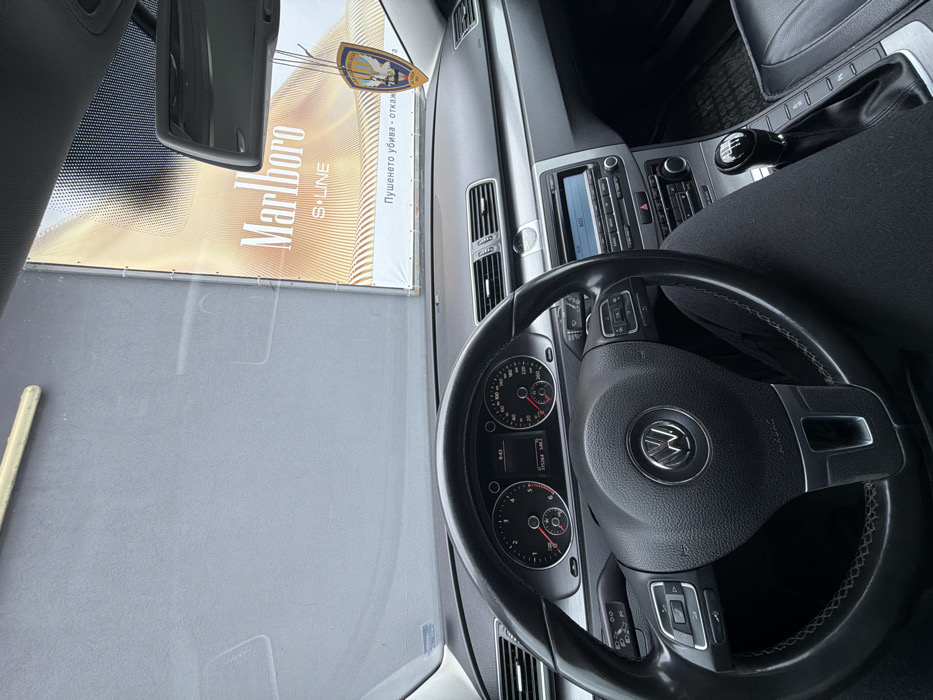 The image captures the interior of a Volkswagen vehicle, specifically the driver's perspective, looking forward through the windshield