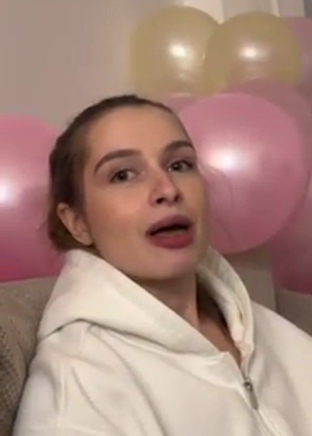 A woman is sitting on a couch, wearing a white hoodie. She holds a potato chip between her upper lip and nose, then puts it in her mouth and eats it. Behind her are several pink and yellow balloons.