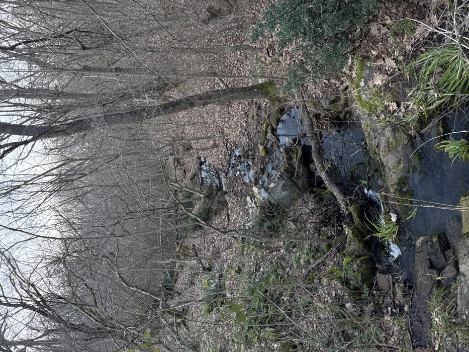 The image displays a forested landscape in Atiya, Bulgaria. A narrow, rocky stream flows from the background towards the foreground, centered within the frame. The stream contains dark water, interspersed with rocks and several fallen logs that partially obstruct its flow. The ground throughout the scene is densely covered with dry, brown leaves. Numerous deciduous trees, largely bare of foliage, are visible, their branches forming a dense canopy against a light, overcast sky. Patches of green moss are present on rocks and tree bases, and sparse green undergrowth, including ferns and grass-like plants, grows along the stream banks and in isolated spots. No human figures or man-made objects are identifiable.